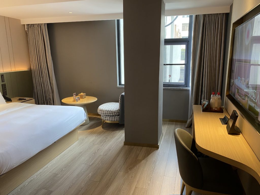 そこから先日も歩いた道を10分ほど行くと、今回予約した宿に到着した。隣はいつも泊まっているチェーンホテルだったが、ここは隣より100元ほど安いチェーンなので一度泊まってみようと思っていたのだ。ロビーはきれいでデザインもおしゃれ。スタッフも親切でよい。部屋もデザイン性が高く、居心地良さそうな空間だった。洗濯機・乾燥機も無料。これならこれからはこのチェーンに変えようかと思う。