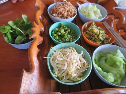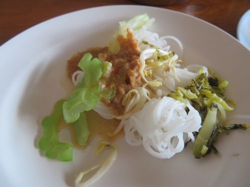 それから朝ご飯を食べに行く。この辺の名物という麺だったが、そうめんのように見える。そこに野菜や汁を自分の好みで掛けて食べる形式。わんこそばを思い出す。かなりの量が腹の中に納まる。タレがうまいのだ。食後はアイスチャイを飲む。ここはコーヒーが有名のようだが、これがまた美味い。何だかタイに来た気分になる。