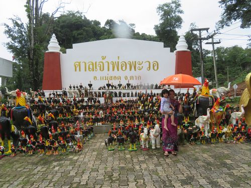 何故鶏が沢山置かれているのか。幸運を呼ぶかららしい。それにしても圧巻の並びに、願いが込められている(笑い)。参拝者も皆記念撮影している。ロンジーを履いたミャンマー人も多く見られる。ミャンマー人がタイ国境を越えて観光に来る、そういう時代に入っているのだ。