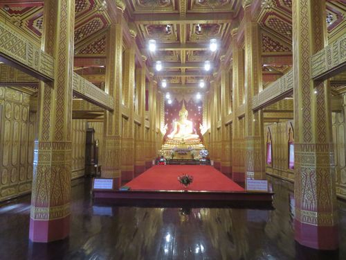 3つ目のお寺で黄金の仏像を拝む。ここはいかにもお金持ちの寺、という印象で、きれいな室内にきれいな輝く仏像が安置されている。最近タイのお寺のお布施箱は、殆どが金庫式になっているのがおかしい。泥棒が多いのだろう。信心も金には勝てない時代なのだろうか。日本でも賽銭泥棒、いや仏像泥棒は多発しており、そのせいか?寺は固く門を閉ざし、用事の無い人間の来訪を歓迎しない。それって仏教なの、と思う事態だ。