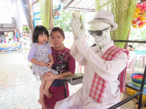 午後も又お寺に向かった。普通の日本人なら、もう勘弁してほしいという気持ちになるかもしれない。その昔の私もそうだったが、今ではお寺の違いや面白いものを見付けて楽しんでいる。最後の寺はそれにふさわしかった。何と境内に骸骨の人形があるのだ。これにはアイちゃんも興味津々。タイのお寺には可愛らしい人形が置かれていて、面白いのだが、まさか骸骨が登場するとは。