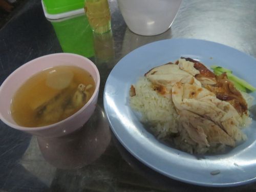 更に歩いて行こうとすると突然雨が降り出す。急いでホテルへ引き返すも、ちょっと腹が減り、食べ物はないかと市場へ紛れ込む。ただ市場も雨で店仕舞いが多く、食べるところがなかなか見つからない。すると一軒、鶏肉をつるした屋台があった。ここで鶏肉を買って部屋で食べようかと立ち寄ると、何と後ろに食べるスペースがあった。
