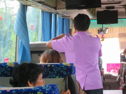 ただいいこともあった。車掌が乗っているのだが、子供や年寄りが乗ってくると、ちゃんと席に誘導し、大きな荷物を抱えた女性などの世話も熱心に焼いている。乗っているうちに寝込んでしまった幼い子を抱っこし続ける母親には、2席空いているところに移動させていた。こういうところがタイのいいところだと思うし、車掌が必要とされる理由だろう。