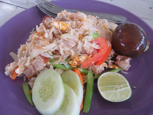 取り敢えず腹が減っていた。外へ出てみたが、すぐには店が見付からない。ちょっと行くと線路がある。これがバンコックとチェンマイを繋いでいる鉄道らしい。その横に店があり、うまそうな豚肉が下がっていた。思わず入って、その豚を指したところ、若者が英語で対応してくれた。しかも日本人と分かるとなぜがとても喜んでくれ、『この豚肉を入れてチャーハンを作ろう、そこに卵も乗せよう』とアドバイスしてくれた。この炒飯、滅茶苦茶うまかった。出来ればもう一度食べたい。この豚肉、かなり念入りに焙っているらしい。てっきり中国系かと思ったが、聞いてみると『中国は嫌いだ』と英語で答えていた。