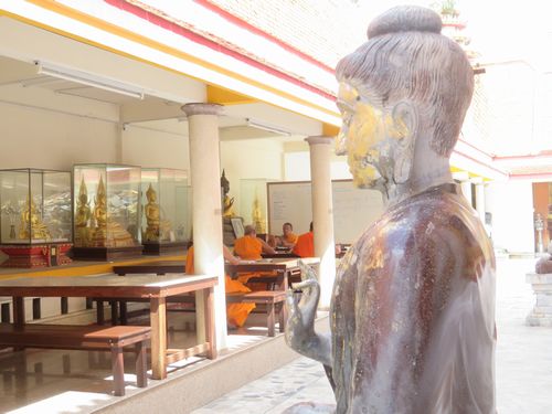ホテルの先の方に寺が見えたので行ってみる。川沿いのワット・ナンパヤーという寺だった。とてもすっきりした仏像が安置されており、暑さもあって、長い時間座り込んだ。外へ出ると、屋根の下でお坊さんが講義をしていた。話しているのは若い坊さん、聞いているのは相当の年配者。どうやら在家が一時的に出家して修行しているようだ。私も修行してみたいように思ったが、この暑さには耐えられそうもない。