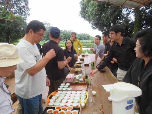 最後に少し山の方に向かった。ドイチャーンティ、初日の夜も、そして昨日のシンポジウムも一緒だったチュチャワル氏が出迎えてくれた。ここは無農薬、有機を追及している茶園であり、タイ、中国、日本とスエーデンのハーフの3人が共同で出資しているというから実にユニークだ。産量は少ないので、ある意味で実験茶園という意味合いだろうか。ここで試してみて、うまくいけば、他に広げていく、という考えがある。横に茶園を見ると、様々な品種が植わり、虫よけが立てられている。