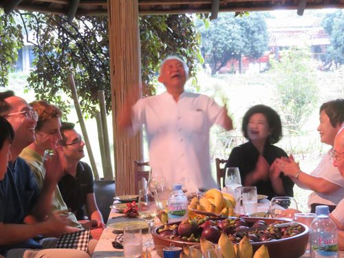 お茶の試飲も数多くした。緑茶、紅茶、烏龍茶、そして独自に作られたエターナル茶。健康に良いお茶だという。途中強い雨が降ってきて、室内で説明を受ける。夕飯もご馳走になったが、カレーなど地元の様々な料理が出てきた。フルーツも豊富。お酒も地酒からワインまで出て、盛り上がる。チュチャワル氏は70代後半と思えないほど元気で、歌を歌い、踊っている。エターナル茶のお陰だろうか。