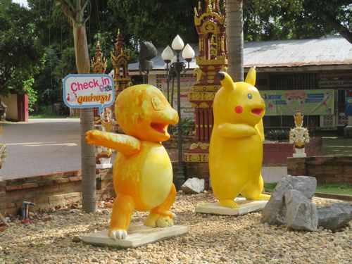 それからはす向かいに見えた寺にも入ってみた。こちらはド派手で対照的だ。しかもユーモラスな坊さんの大きな像があり、また頭がいくつも伸びる観音像、そしてポケモンのピカチューまで置かれており、とても寺とは思えない。学校が併設されていたが、まるでテーマパークかと思う。