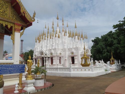 ワット・ポースワンという寺は実に鮮やかな白い仏塔が並んでおり、気持ちがよいほどだった。ここも廃寺を富豪が修復したという。裏には立派な涅槃仏もあり、ちょっと心洗われる感じがする。本堂に入ろうとしたが、ちょうど坊さんが読経中だったので控えた。天気が良いせいか、白い色が目に沁みる。