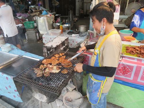 夕方、街と反対の方に歩いて見たが、道路があるだけで面白くない。夕日がずんずん落ちていくだけ。街に戻ると市場があり、いい匂いのコムヤーンが出来上がっていたので、思わず買い込む。ホテルの部屋で食べるはずが、歩きながら少しずつ食べているうちに無くなってしまうという意外な展開。昼ごはん食べなかったから、腹が減ったのだろう。お腹にコーラを注いで満腹。その夜もよく歩いたので疲れてよく眠れる。