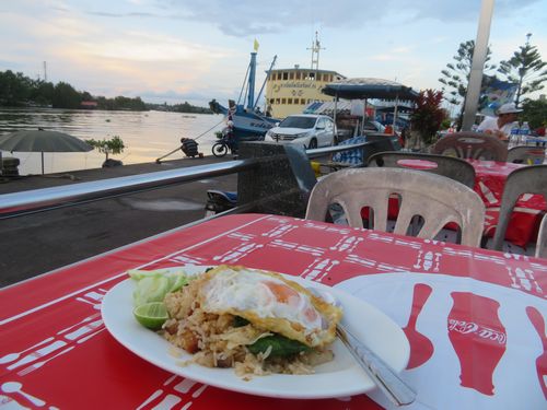 宿に帰り、休息する。それほど日差しが無くても、暑いのだ。窓の外を見ると天気は下り坂。軽く雨が来そうだと思い、昼寝していると夕方になってしまう。また外に出てひたすら歩く。特に見るべきものもないので、寺へ行ったが、本堂は開いておらず、おまけに犬に追い出された。仕方なく川沿いを眺める。そこには露店の食堂も出ていたので、夕飯はまだ日も暮れていない中、ここで叉焼入りの炒飯を食べることにした。これが意外とうまく、幸せになる。
