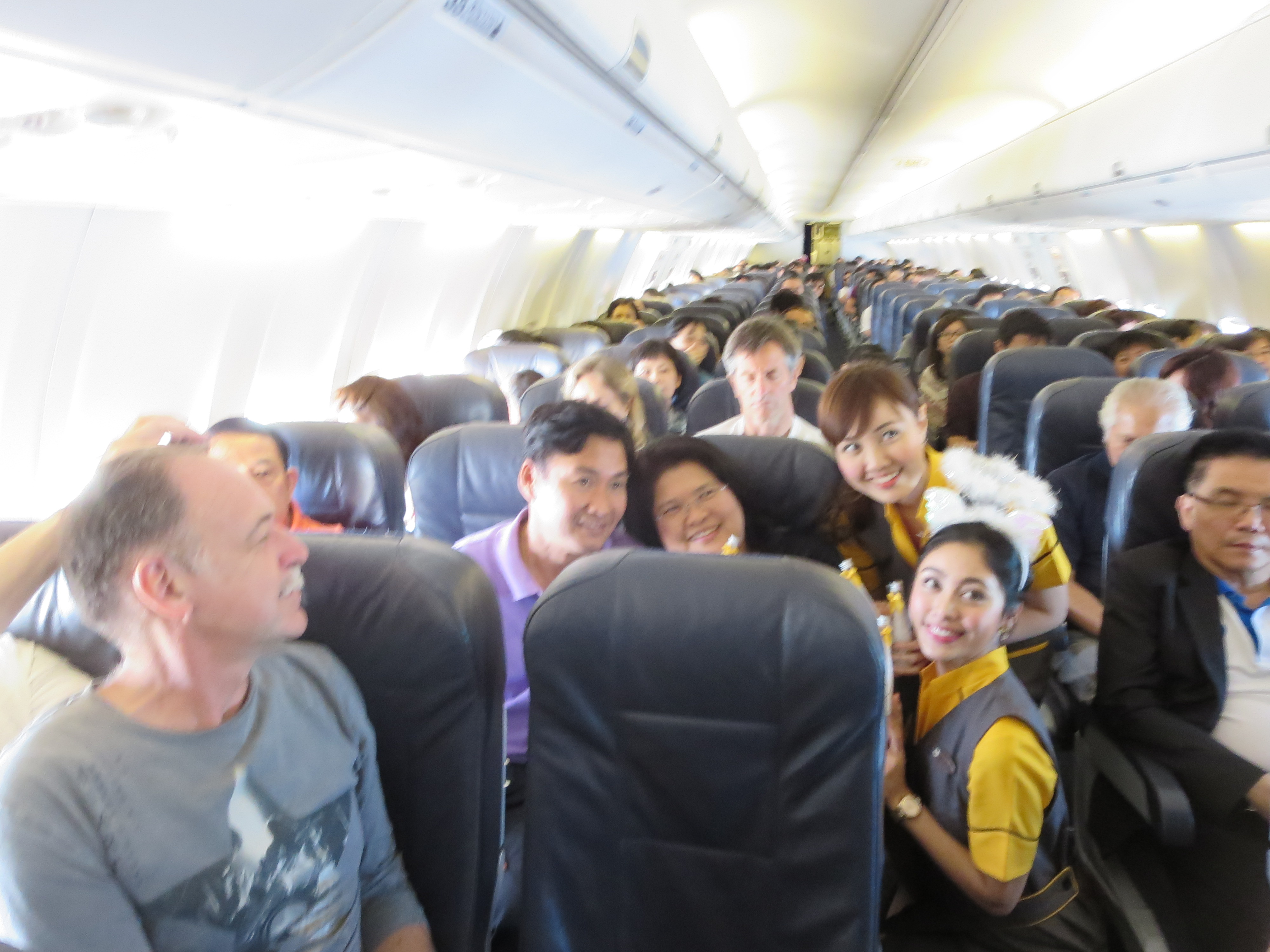 フライトはほぼ定刻に、ほぼ満員の乗客を乗せて出発した。搭乗ゲートで驚いたのは、若いCAが頭に天使のような被り物??をしていたこと。Uさんが思わず『おー』と声を上げた。ノックエアーはタイのLCCながら、預け荷物20kg無料とか、水とパンを出すなど、ちょっとしたサービスでファンが多い。実は今日はバレンタインデー。タイにもバレンタインがあるのか、などと野暮なことを考えていると、何と機内のカップルを探して、彼女が一緒に写真に納まるという奇抜なサービスを展開していた。これはこれで面白い。タイ人もこういう企画には結構ノリが良く、若者も年配者もCAを呼んでいた。