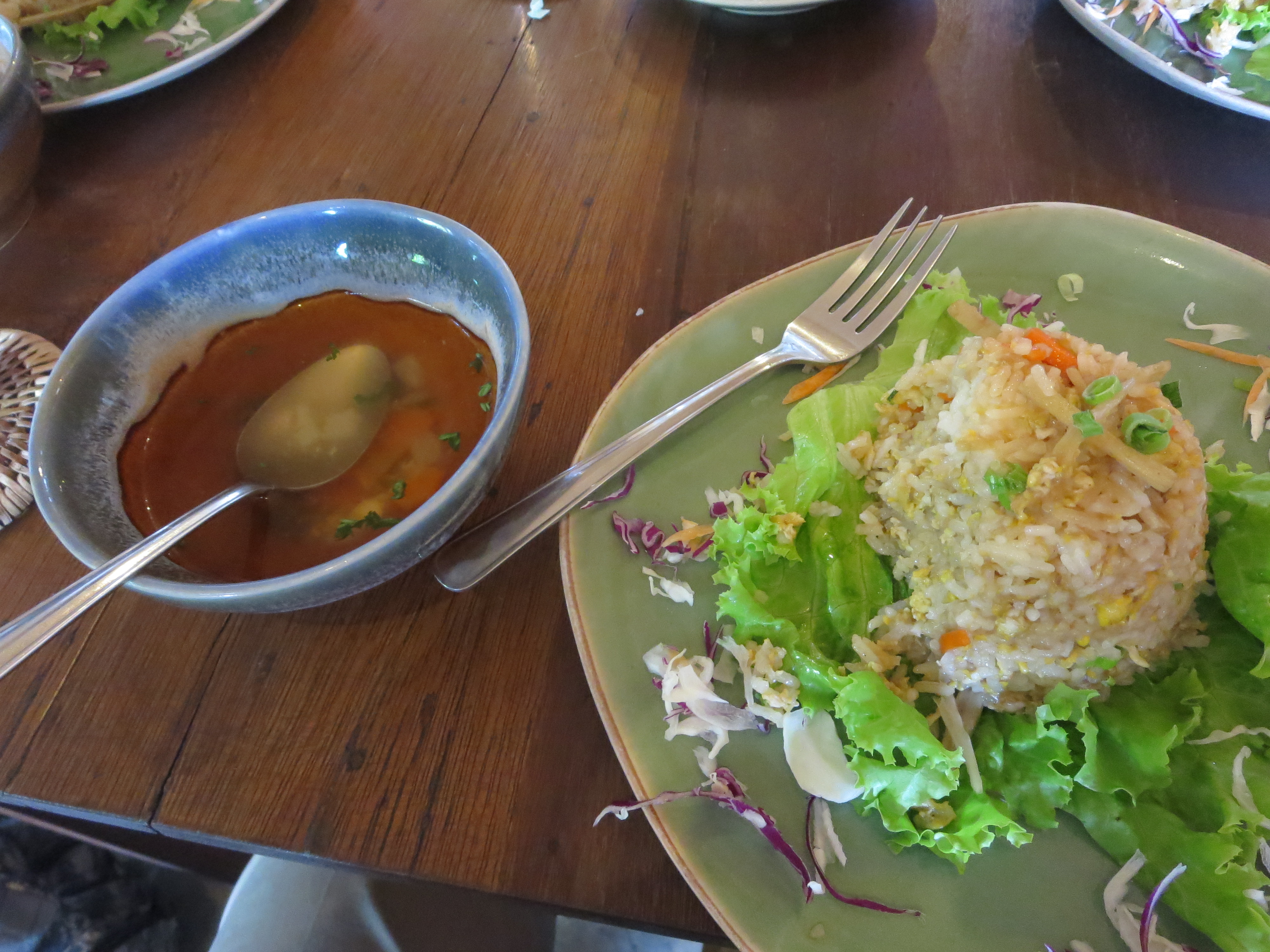 それからご飯を注文して、ゆるゆると食べる。ここの食べ物、本当に美味しい。辛いタイ料理に疲れたあなた向け、という感じで胃にやさしい。前回食べてとても美味しかった『ごぼうと雑魚の和風チャーハン(野菜スープ付)』を注文。とても日本を感じさせる味ながら、日本にもないな、という一品。優れものだ。