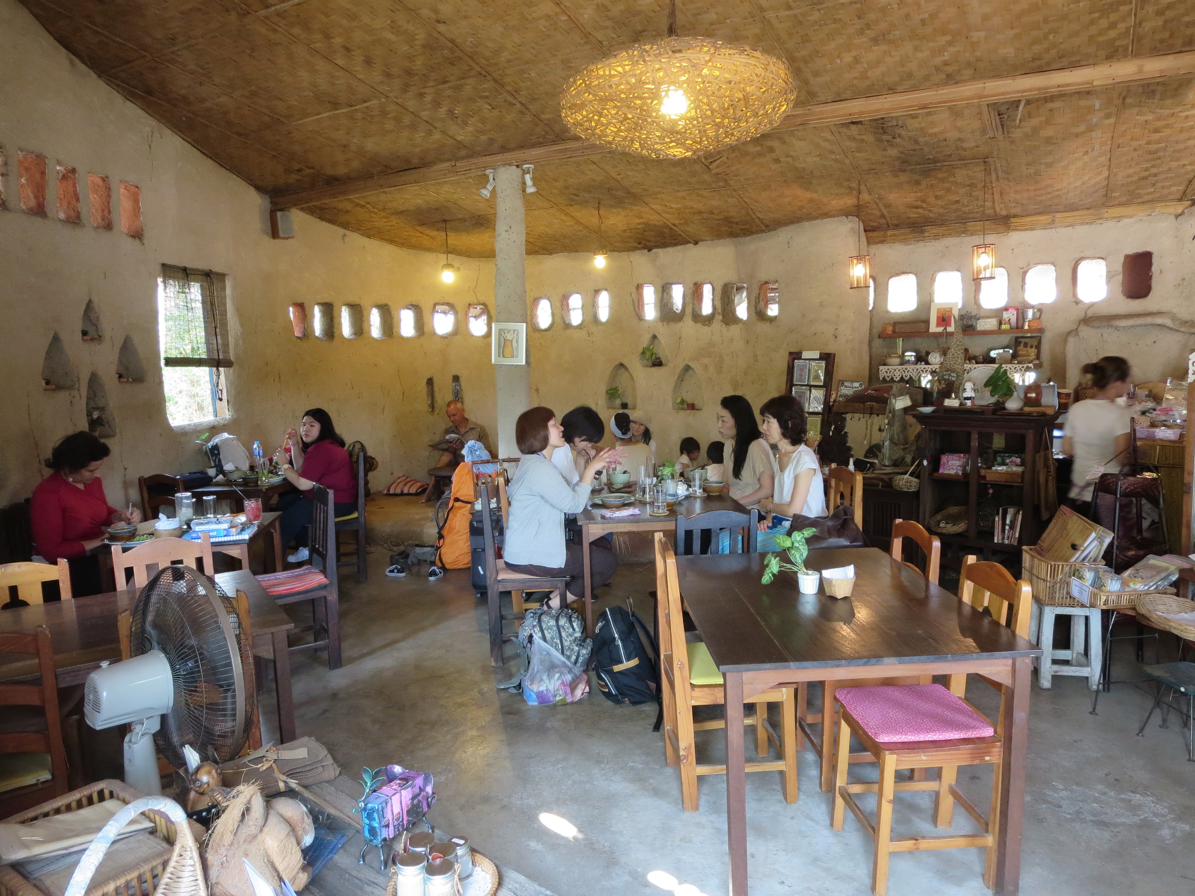 店に入るとすでにチェンマイ入りしていたGさんが大きなバックバックを持って来ていた。開店と同時に入ってずっとネットしていたらしい。我々も飲み物を頼んで、まずはお茶タイム。そこでお互いの近況などを語り合い、これからの旅のムードを高める。すると店内にはどんどんお客さんが入ってきて、ほぼ満員になる。何とUさんはここで知り合いの日本人一家と再会していた。チェンマイ在住の日本人なら誰でも知っている場所、チェンマイ大学あたりでイベントでもあれば、皆が立ち寄る場所、という位置づけだろうか。