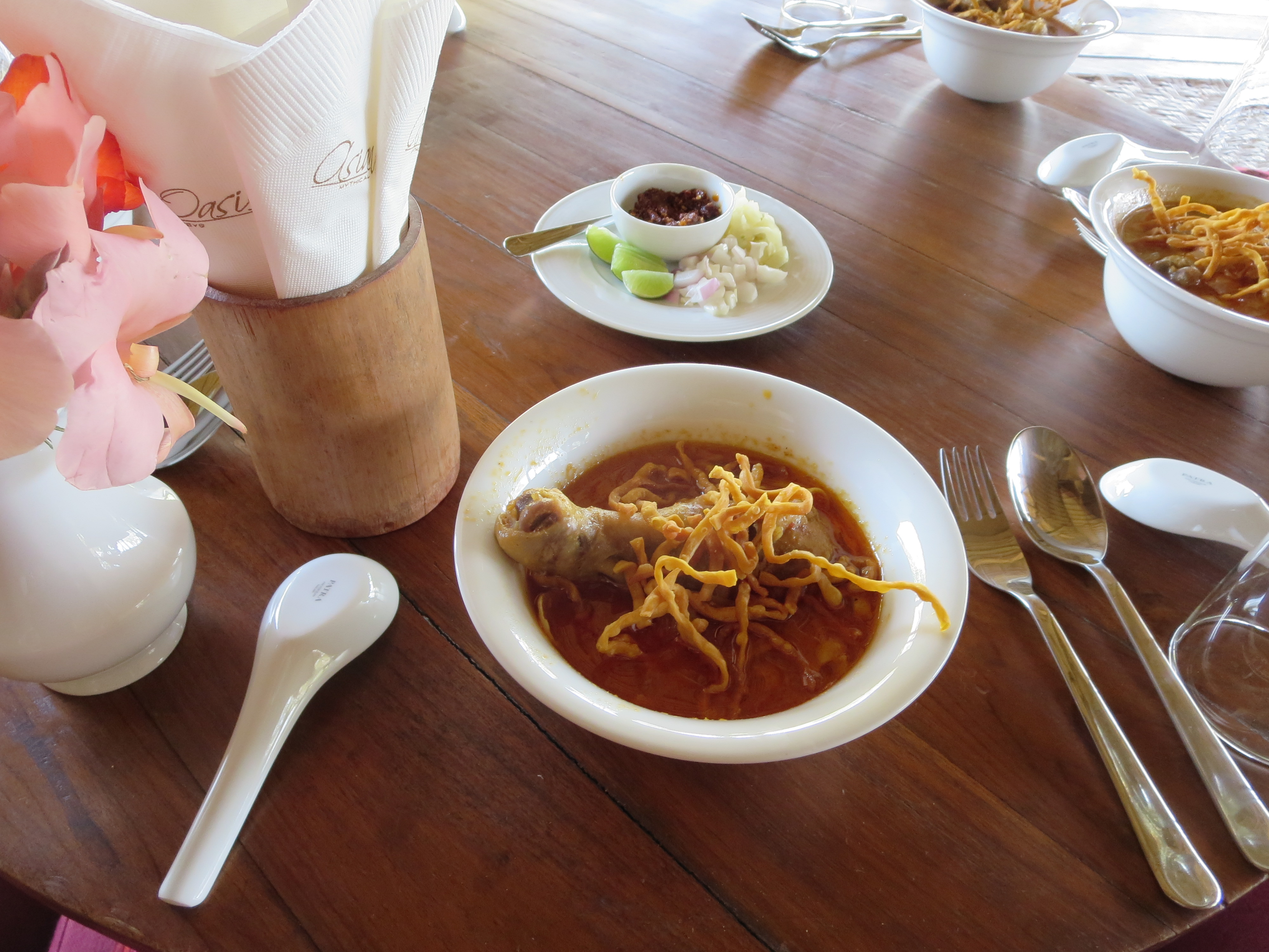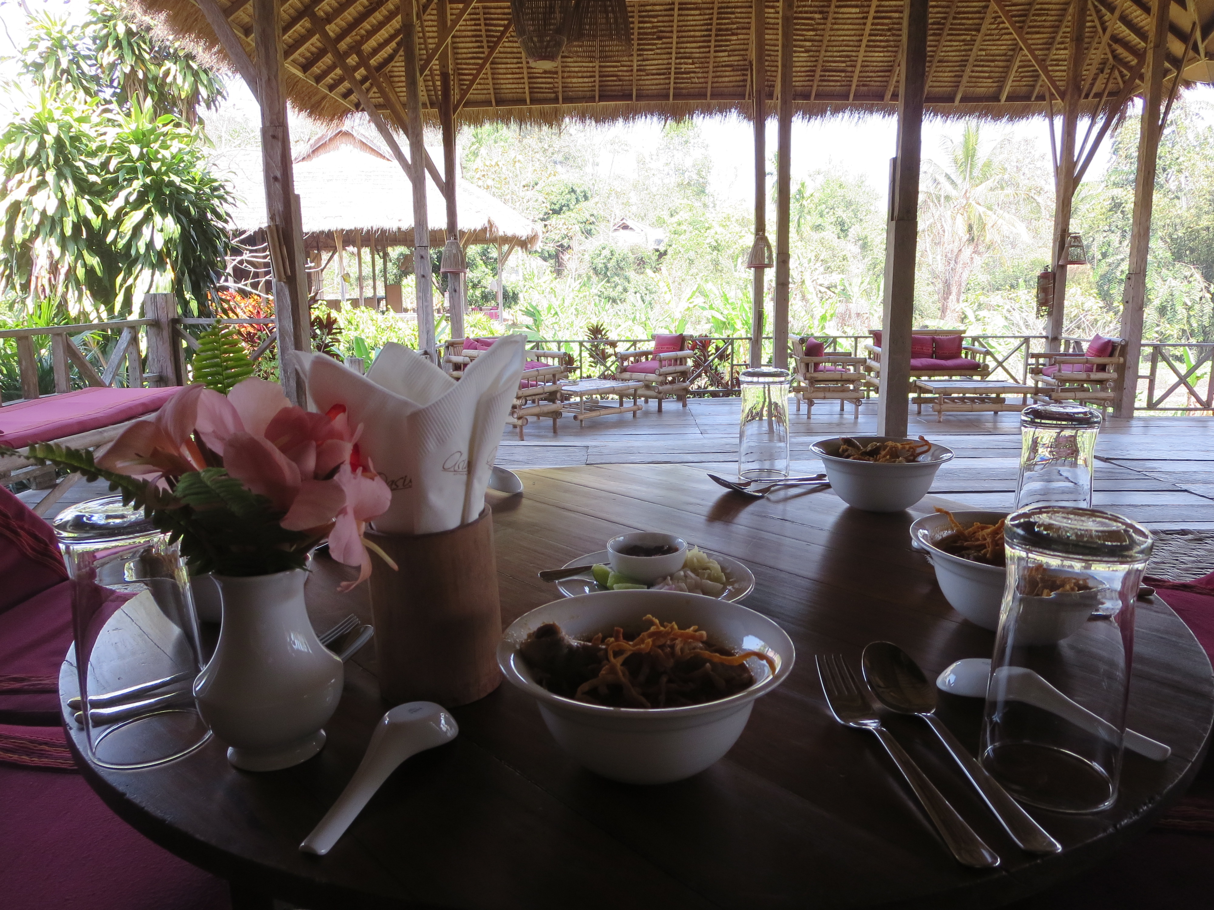 宿に戻ると、ランチが用意されていた。テーブルの上にカオソイが載る。美味しそう、運動の後はこれぐらいの軽食が良い、と喜んで食べていると、スタッフがゆるゆるとやって来る。何とカオソイは前菜?で、肉料理やパッタイなど、豪華なメニューが並ぶ。どうやらこのロッジ、メインはランチではないかと思うほどの分量が出てきた。