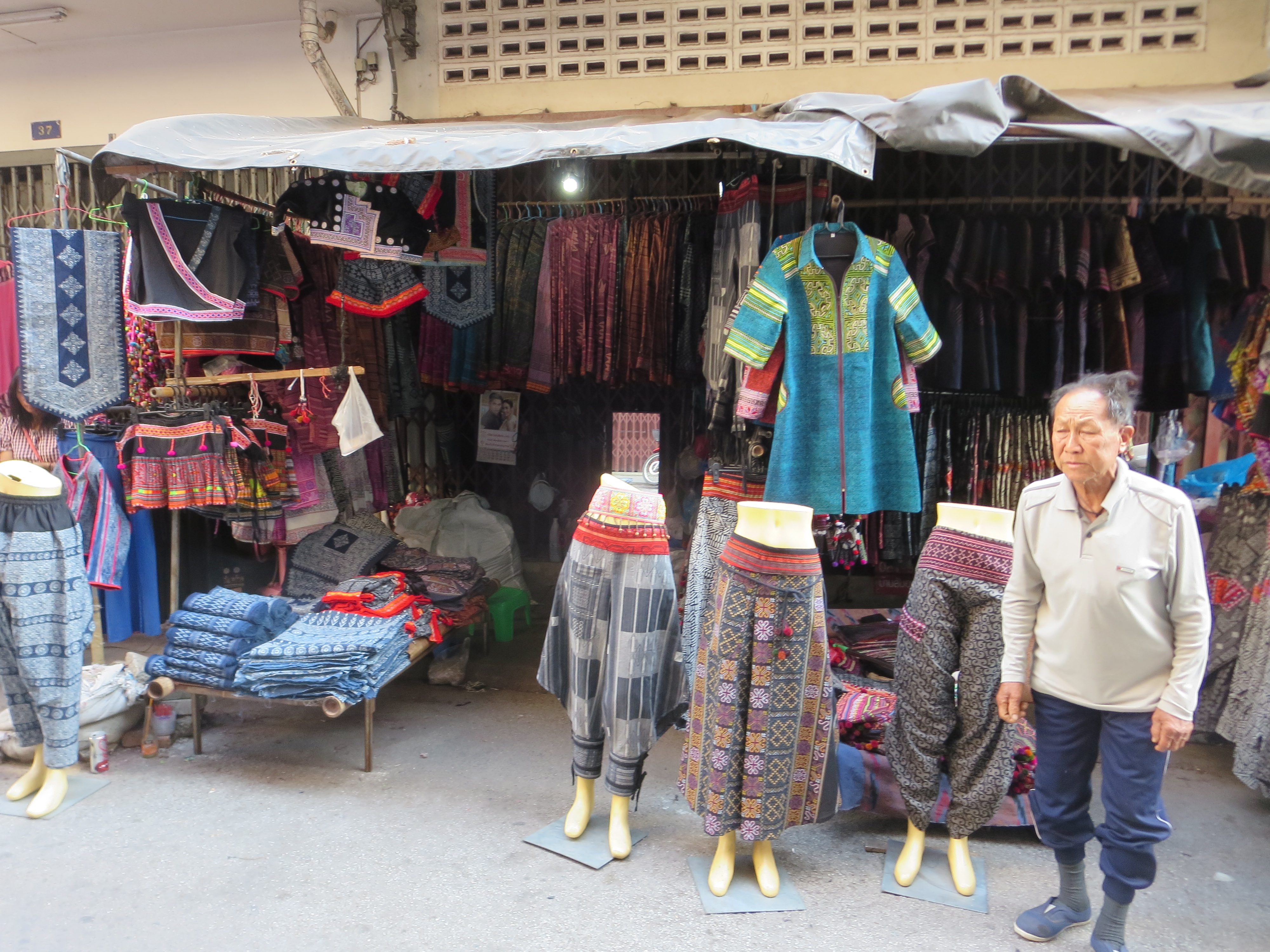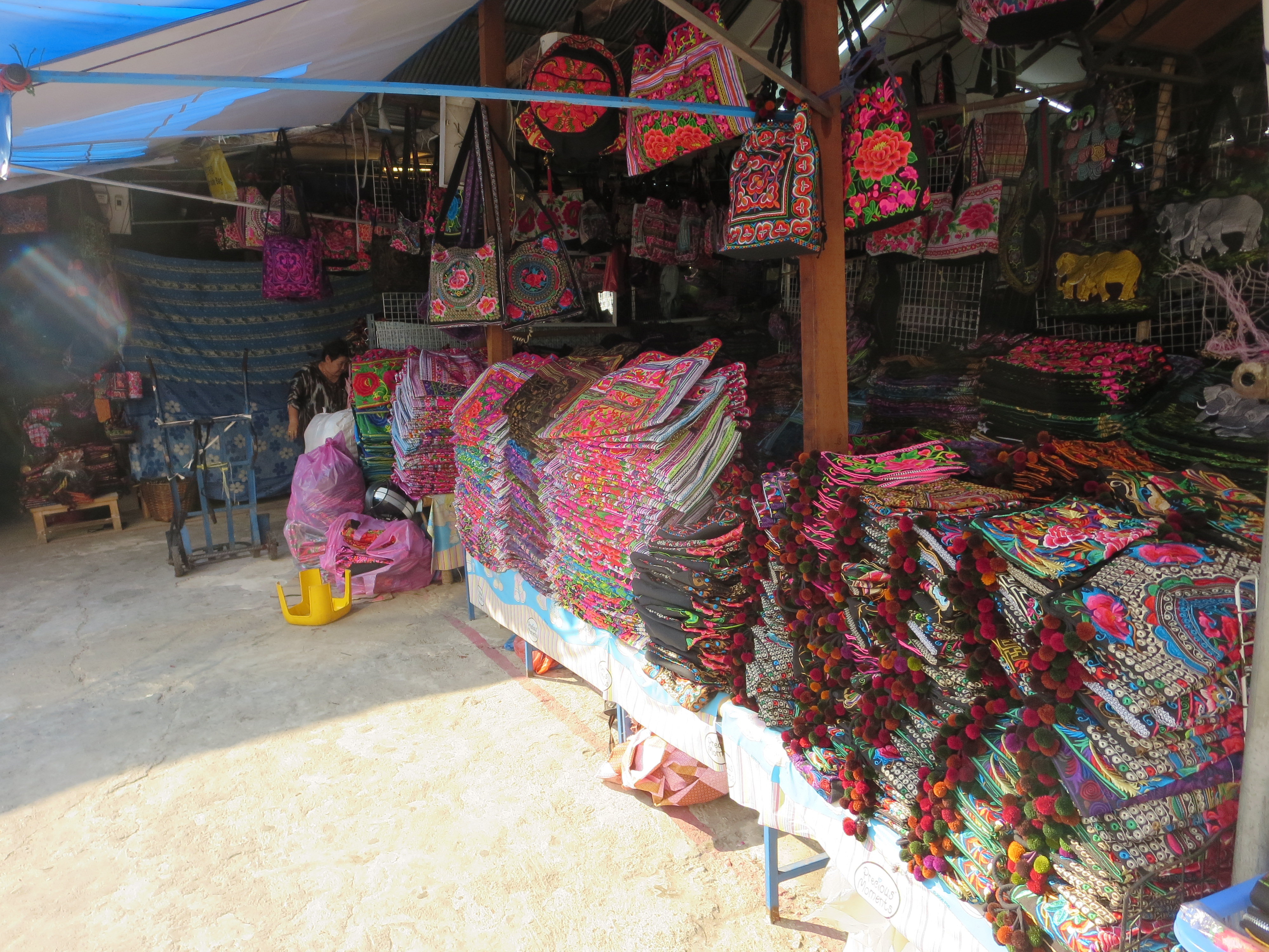 そして元来た道を戻り、服を売る店を探して、そこの路地を入っていく。奥に静かな、小さな市場があった。午後の日差しを浴びているが、お客は殆どいない。これでは見過ごしてしまう訳だ。土産物になるバッグや布が沢山売られていたが、もう一工夫しないと、売れないような気がする。いや、ここは卸しで、バンコック辺りから買い付けの人が来るとも聞くので、小売りには力を入れていないのかもしれない。むしろ市場の脇あたりで小売りしている個人の方が買い安い物を置いているようだ。