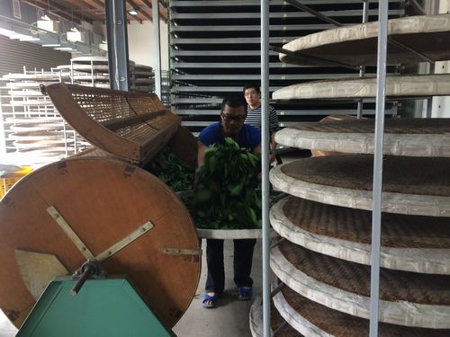 工場を開けると、2階では沈香の葉が広げられていた。室内萎凋だ。それが終わると、1階にある機械で揺する。揺青だ。茶師も来て、本格的に茶作りの要領で作っていく。しか原料の沈香の葉はどこから来るのだろうか。彼によれば、台中郊外に植えている人がおり、そこから買うらしい。健康飲料として、結構いい値段で売っているという。将来は自分で沈香の木を植えてみるのもよいかというほどだ。