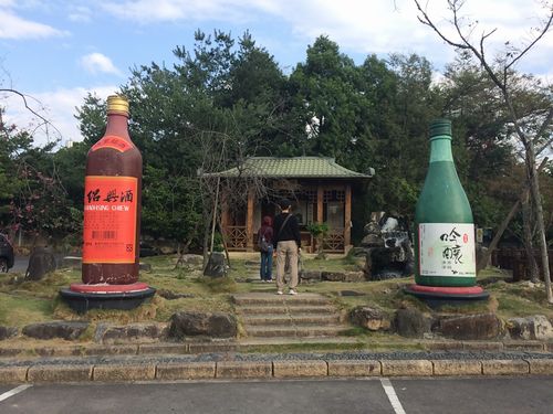 その昔、台湾で働いていた頃は紹興酒をたらふく飲まされたが、台湾人は紹興酒など好きだったのだろうか。それとも日本人は中華料理と言えば紹興酒、なので、飲ませたのだろうか。ここも921大地震で大きな被害が出たがいち早く復興させたらしい。建物の外へ出ると、そこには紹興酒と吟醸の大きな瓶の模型があり、その奥には廟があった。日本時代には神社があったのだろうか。