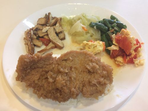 それからバスターミナルまで歩いて行く。ランチを食べようというので、ターミナルの向かいのこぎれいな食堂に入ってみる。ここも私は普段近寄らない場所だ。店はかなり混んでいたが、何とか席を確保し、排骨飯を注文した。量が少なく、ちょっと高めだが、盛り付けが上品。若者にはこんな店がよいらしい。