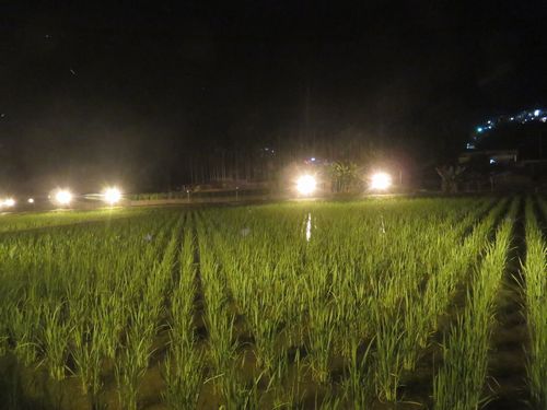 マコモダケの畑は、何となく稲作の水田に似ている。ただ真っ暗な道を行くと、煌々と電気が点いている場所があった。そこが畑であり、驚く。かなり大規模な設備をつけている。マコモダケは夜、光を与えると成長するということらしいが、何だか可哀そうに思ってしまう。自然の日の光で成長してもらった方がよいのでは、などと思うのは、農業を知らない素人だからだろうか。