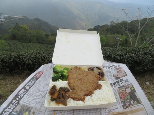 慰霊碑のようなものが建っていたので近づいてみると、なんと日本語が書かれている。1970年代に日本人夫妻がここに住み、宗教活動?を行っていたらしい。1980年代に相次いで亡くなったが、その信者たちにより、碑が建てられたとある。工場に戻ると、昼の弁当が運ばれてきた。茶園に弁当を配送する商売があるのだろうか、それとも親戚あたりが運んできたのだろうか。とにかく絶景の茶園を眺めながら、弁当を頂くのは気持ちがよい。でも茶は全くでない。