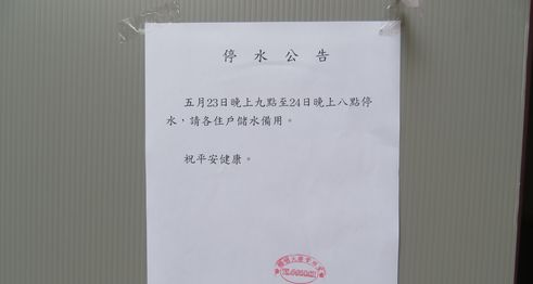 昨晩宿へ帰ると、近所のおばさんから『早くシャワーを浴びなさい。今晩9時から丸一日断水だから、トイレに水を溜めておいて』と急に言われる。後で見ると確かに張り紙があったが見落としていたようで、おばさんに感謝してすぐに言われた通りにした。寝る前に歯をみがいたが、水は普通に出ており、且つトイレの水も問題なかった。まあ台湾だから時間のズレもあるだろうと思って寝た。