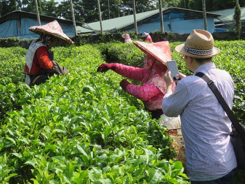 李さんが迎えに来て、魚池に向かう。天気が良く、ちょうど茶摘みが始まった茶園に直行した。地元のおばさんたちが手摘みしている姿を写真に撮る。既に気温はかなり上がっており、茶摘みは辛い作業になっている。完全防備のおばさんたちが手に刃を付けて起用に摘んでいく。