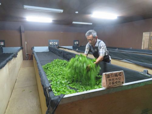 それから李さんのお兄さんの家でお茶を飲む。ここにも2度ほどお邪魔しているのでもう慣れたものだ。李さんは作業があるので我々はここで待機している。少しすると李さんが摘まれた茶葉を運んできて、茶工場へ向かうというので同行する。彼は道路沿いの茶工場を借りていた。生葉を2階に上げ、すぐに萎凋槽に入れる。