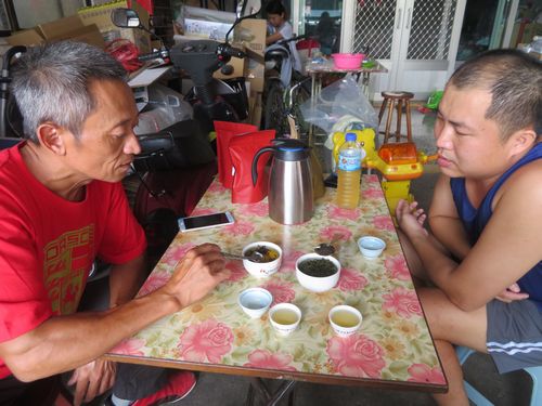 竹山の郊外、場所はどこか分らないが、大きな木のある家を訪ねていく。小さな店でお母さんは檳榔を作っていた。この家の李さんは茶を商いながら自らも作っているという。魚池の李さんはここに茶の包装用パックを買いに来た。何だか話はよく見えないが、面白そうだ。李さんが作ったという紅茶や烏龍茶を飲ませてもらう。とても熱心な人だ。