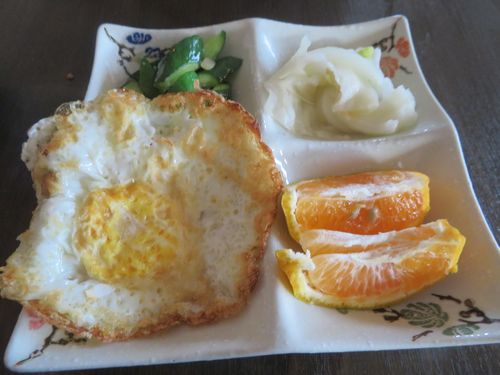 翌朝は気持ちよく?目覚めた。1階におり、何とかシャッターを開けて、外へ出てみる。夜はちょっと怪しげに見えた宿だが、朝は爽やか。朝食もちゃんとついていて、お粥の上におかずも豊富でよい。ここの客はカップルもいたが、若者男子4人組とか、女子2人組とか。老夫婦までいて、その利用層の幅はかなり広い。利用者に支持され、儲かっているのではないだろうか。
