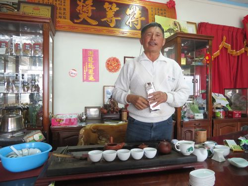 午後は梅山の茶の歴史を聞きに行く。食堂の横にある今は営業していない宿に行くと、林さんと陳さんが待っていてくれた。林さんは80歳だというが、非常に元気で、自らの茶業体験を熱く語ってくれた。ここはかなり貧しいところで、地瓜などを作るだけで出稼ぎなどに行く者も多かったが、1979年頃、茶業改良場の指導もあり、高山茶向きの茶樹を植え始めたという。