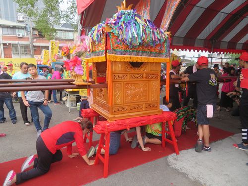 埔里の媽祖祭りはどんなものだろうか。興味が出てきたので、歩いて集合場所付近まで行ってみた。大きなテントが張られ、媽祖様が鎮座している。大きな人形があり、山車に載せられた小型のものもあり、1つ1つが意味するものは不明だが、既に多くの人が集まってきている。