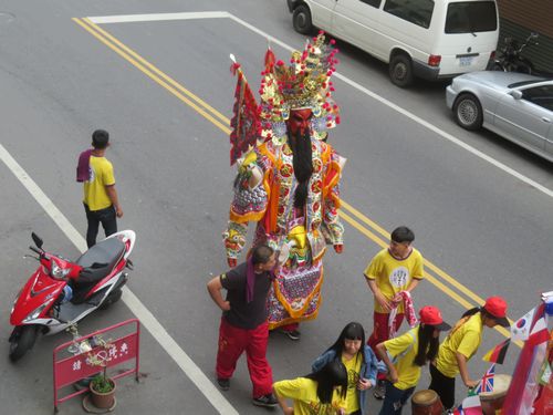 今日は土曜日、ボーっとそんなことを考えていると、外から大きな音が聞こえてくる。覗いてみると、お祭りの行列のような一団が向こうから練り歩いて来るではないか。何だあれは。そうか、今日は埔里で媽祖祭りが行われると、街頭にポスターが貼ってあったことを思い出す。