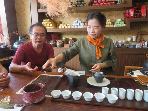 奥さんが淹れてくれたお茶を飲みながら話を聞く。実はこの奥さん、茶の世界では有名な方だという。この茶荘も独特で、何だか骨董品屋かと思うほど、色々な茶道具などが置かれている。しかもよく見ると、日本の物が非常に多い。茶道の道具などの収集家のようだ。日本にも何度も行っているという。ふと置かれていたいた建水、その昔爺さんが煙草盆の代わりに使っていた物にとても良く似ていて驚いた。