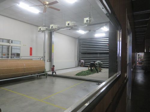 車は鹿谷に向けて降りて行く。山から直接竹山に降りる道もあったが、もう一軒寄り道するらしい。街道から離れ、ちょっと分り難い道を行くと、いきなり茶工場が見えてきた。その付近には少しだけ茶畑も残っている。工場には摘まれた茶葉が持ち込まれ、先進的な機械で、室内萎凋が始まっていた。