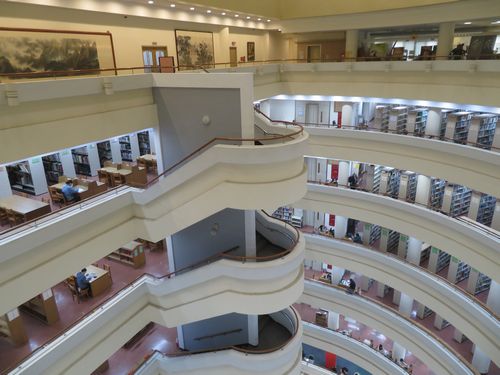 門を入るとすぐそこに図書館棟があった。身分証(パスポート)を預ければ簡単に中に入れた。親切にも『日本人ですか?ここの8階には台北高校関連の展示室がありますよ』と教えられ、覗きに行くこととなる。一体どれだけの日本人がここに見学に訪れるのだろうか。8階まで登ると、建物の中央は空洞で、なかなかきれいな景色が見え、そして勉強している学生の姿も見える。