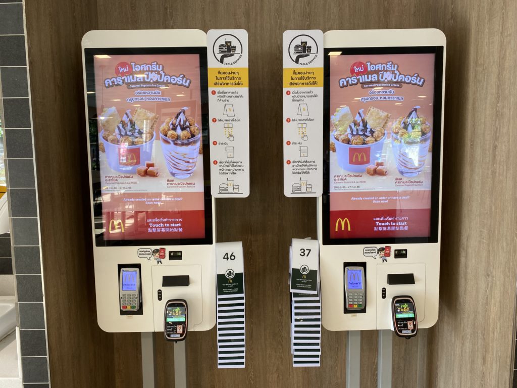 戸惑っていると係員がタイ語でこっちだよ、と指し示す。見るとタッチパネルが設置されており、皆サクサクと注文している。英語もちゃんとあるのだが、この操作がなかなか難しい。係員は英語も出来たので、結局私は言葉で言って、彼女が打ち込む羽目となる。ようやくオーダーできると、隣のお渡しカウンターで支払いをする。これもタイ人の若者はキャッシュレス化しており、ここには来ない。