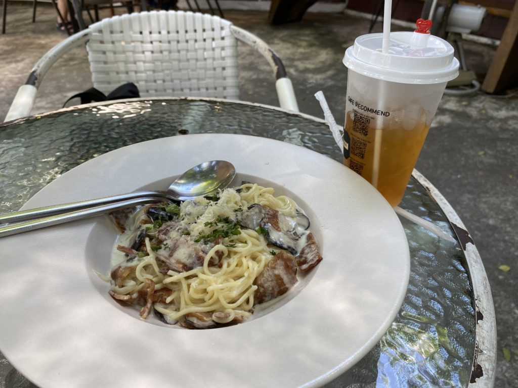 面談が終了して、池の方へ歩いてみる。コロナ前、中国人が映画の聖地巡礼で沢山訪れていた場所だ。そこにおしゃれなカフェがあったのは前から気づいていたので、今回は思い切って入ってみる。アイスティーとパスタを注文して、外の席で一人寛ぐ。中国人客も何組かいたが、そこまで気にならない。ああ、いい雰囲気だ。帰りもまたソンテウを捕まえる。