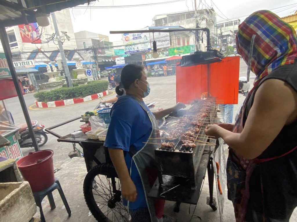 朝いつものように散歩する。そして五差路でいつものようないい匂いに巻き込まれ、吸い寄せられた。前回は試しに二本だけ買って歩きながら食べた串焼き。今日は耐えられず4本買い、更にはカオニヤオまで買ってしまった。それでも僅か29バーツ。本当に安い。焼いている人は煙にまみれて大変だ。部屋まで持って帰り、朝から幸せ。