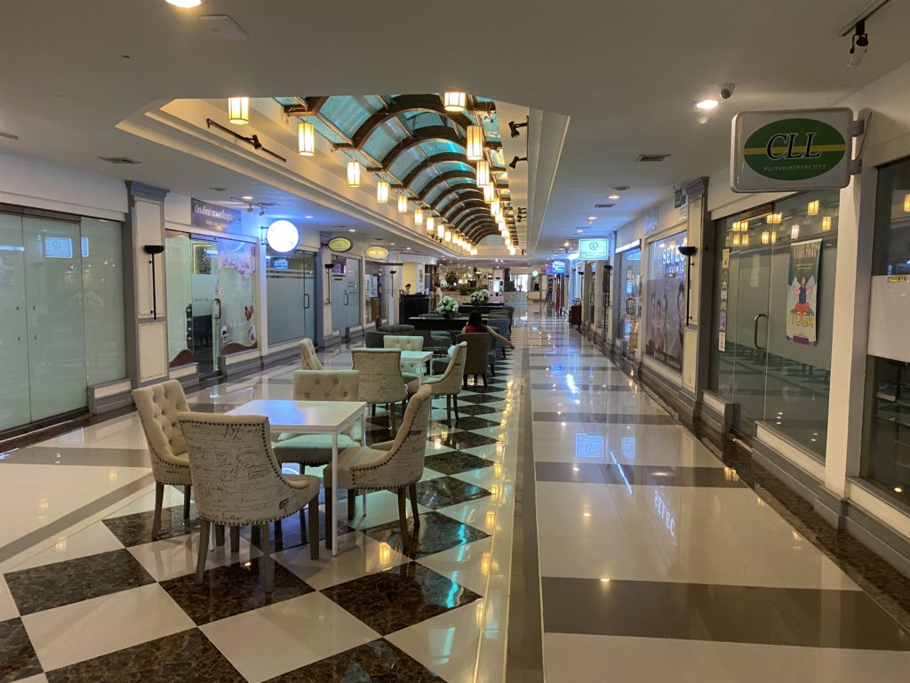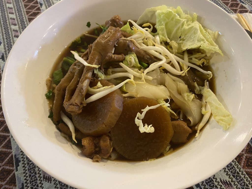 仕方なくロビー付近で麺を食べることにした。鶏麺を注文すると『もうほとんど鶏肉はないが、鶏の手足入りスープでいいか』と聞かれたので、応諾した。大根がしみ込んだスープ。何だかとても懐かしさを感じながら、ゆっくり食べる。コラーゲンたっぷりだろうか。60バーツ。