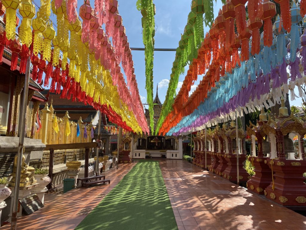 街中に入るのは初めてかもしれない。ワットパタタリプンチャイという古い、とても立派なお寺へ行くと、ロイクラトーンの飾りがきれいされている。お参りするタイ人も多くいる。いい天気の中に仏塔が映える。寺の前にはきれいな公園もセットされており、女性像が中心にある。