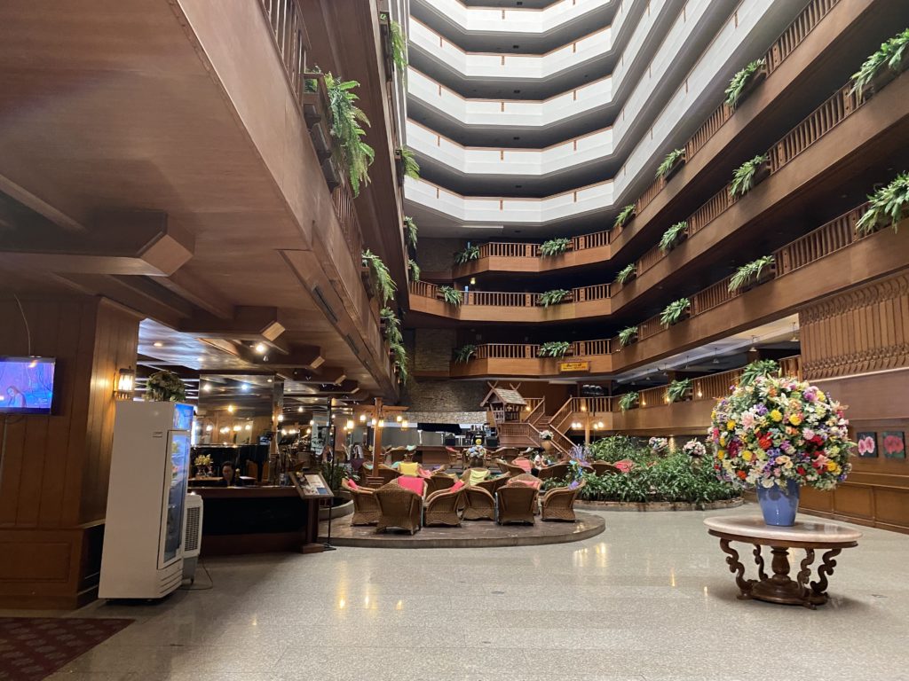 併設されていたショッピングモールが無くなり、表通りからも遮断され、一方大きな木々に囲まれており、夜ホテルに戻るのはちょっと怖いらしい。ホテルに入ってみるととても立派なロビーが待っていた。中国人観光客が泊っており、中国語が響いていたが、客は多くなさそうだ。この向こうには表通りに面した、昔の一流ホテルがあるのだが、この付近立地は悪くないと思うのだが、随分と落ち込んでいるようだ。