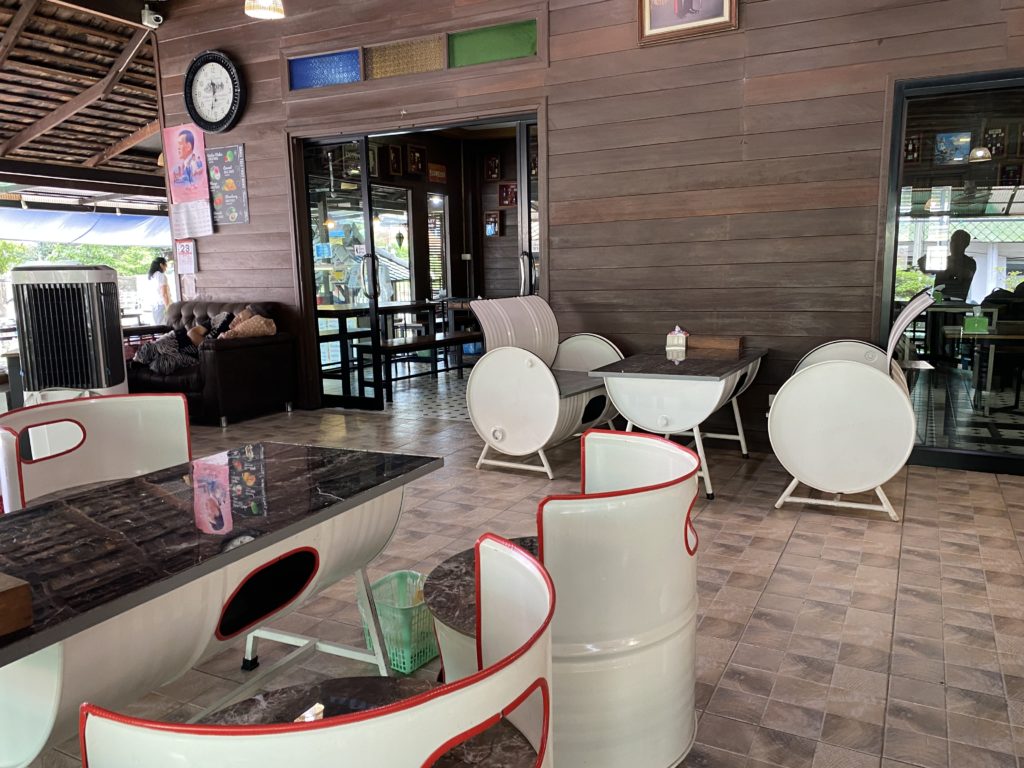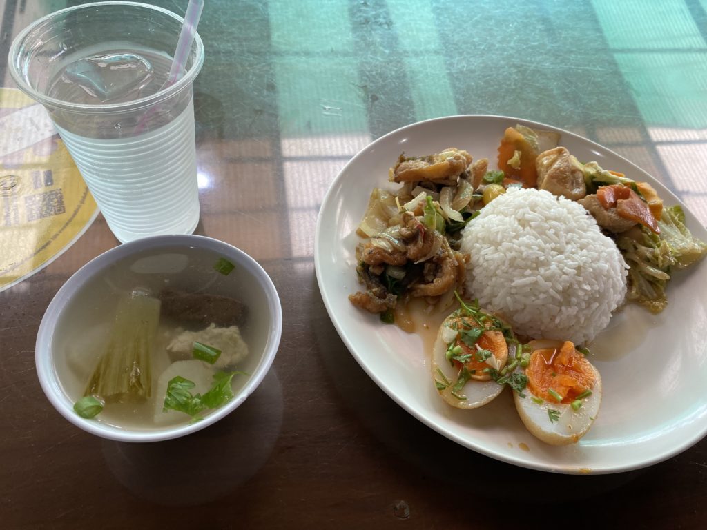 これまで2度行って、2度とも閉まっていた食堂に再チャレンジし、ついにご飯にありついた。ここは外国人にもかなり評判が良い店。何といっても、一膳めし屋ではなく、カフェ風の作りが良い。食事は置いてあるものから選び、ご飯を添えてもらって食べる。2品選んで、スープは無料、75バーツは言い感じだ。料理も悪くない。やはりメニューが分かり難い場合、目の前にあるものを指すのは確実だ。